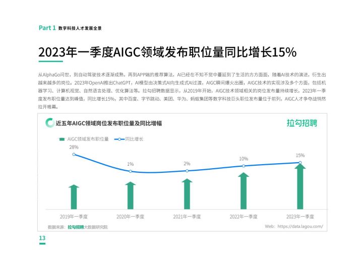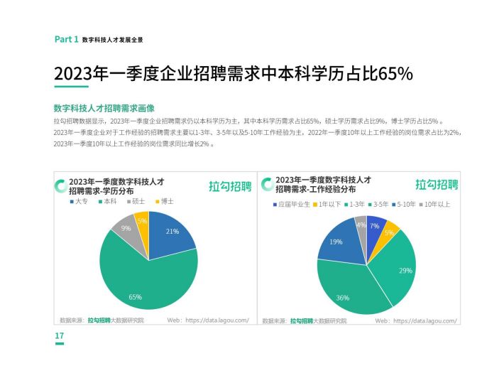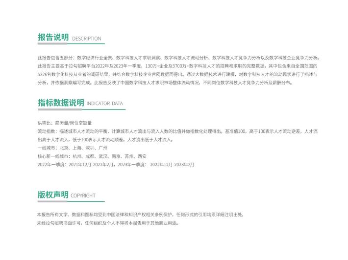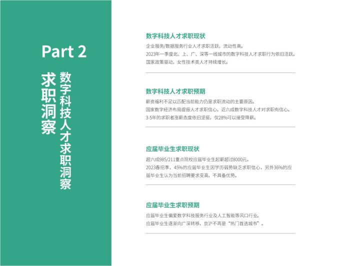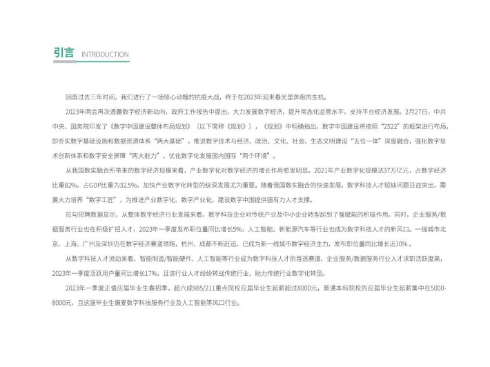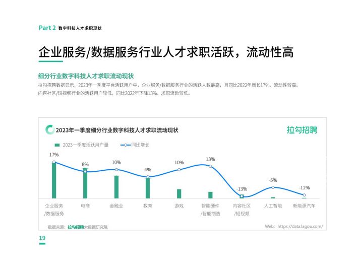 从数字科技人才流动来看,智能制造智能硬件、人工智能等行业成为数字科技人才的首选赛道,企业服务/数据服务行业人才求职活跃虔高2023年一季度活跃用户量同比增长1796,且该行业人才纷纷转战传统行业,助力传统行业数字化转型。