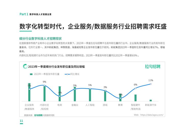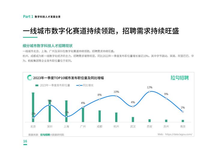 拉勾招聘数据显示,从整体数字经济行业发展来看,数字科技企业对传统产业及中小企业转型起到了强属模的积极作用,同时,企业服务/数据服务行业也在积极扩招人才,2023年一季度发布职位量同比增长5%,人工智能、新能源汽车等行业也成为数字科技人才的新风口。一线城市北京、上海、广州及深圳仍在数字经济赛道领跑,杭州、成都不断赶追,已成为新一线城市数字经济主力,发布职位量同比增长近1096。