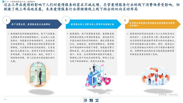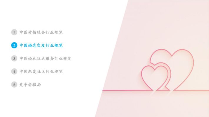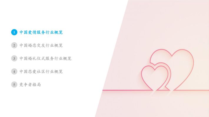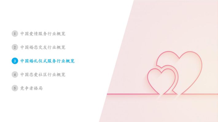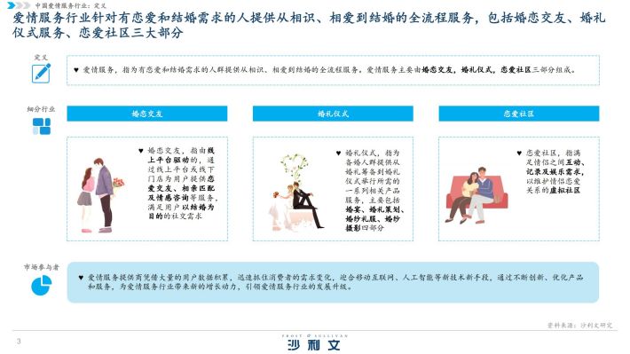 爱情服务行业针对有恋爱和结婚需求的人提供从相识、相爱到结婚的全流程服务,包括婚恋交友、婚礼仪式服务、恋爱社区三大部分