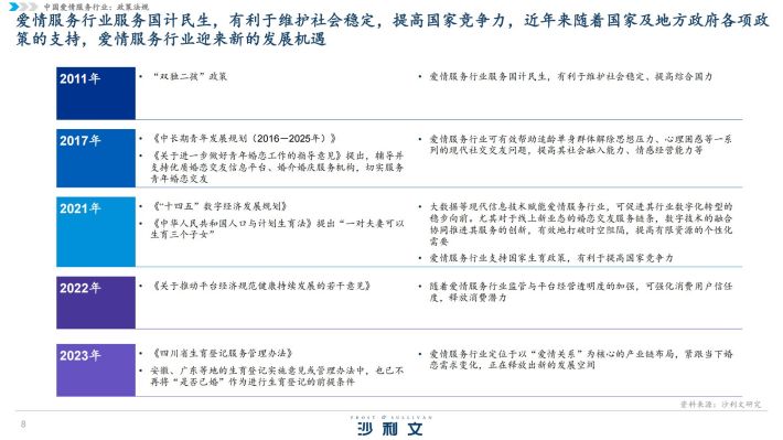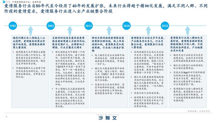 爱情服务行业自80年代至今经历了40年的发展扩张,未来行业将趋于精细化发展,满足不同人群、不同阶段的爱情需求,爱情服务行业进入全产业链整合阶段