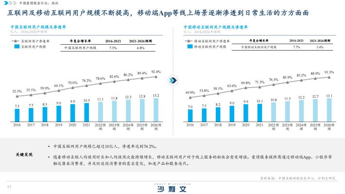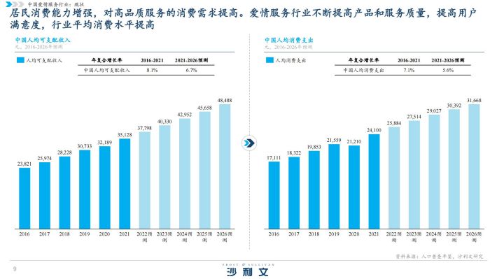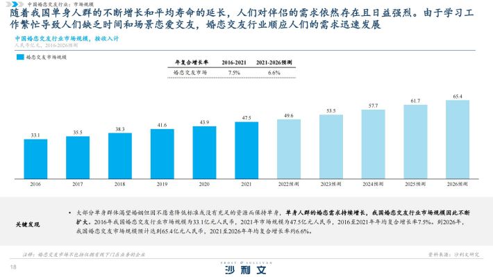 从细分行业来看,婚恋交友行业和恋爱社区行业未来仍将保持较高速的增长,2021至2026年年均复合增长率分别为6.6%和10.9%。受结婚人数逐年减少和疫情的影响,婚礼仪式服务行业2021年至2026年市场增速放缓但仍以4.1%的增长率稳步增长。