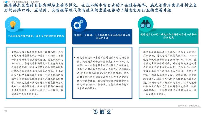 爱情服务提供商凭借大量的用户数据积累,迅速抓住消费者的需求变化,迎合移动互联网、人工智能等新技术新手段,通过不断创新、优化产品