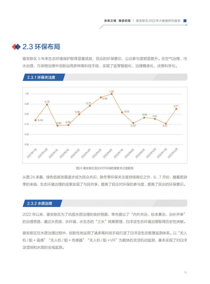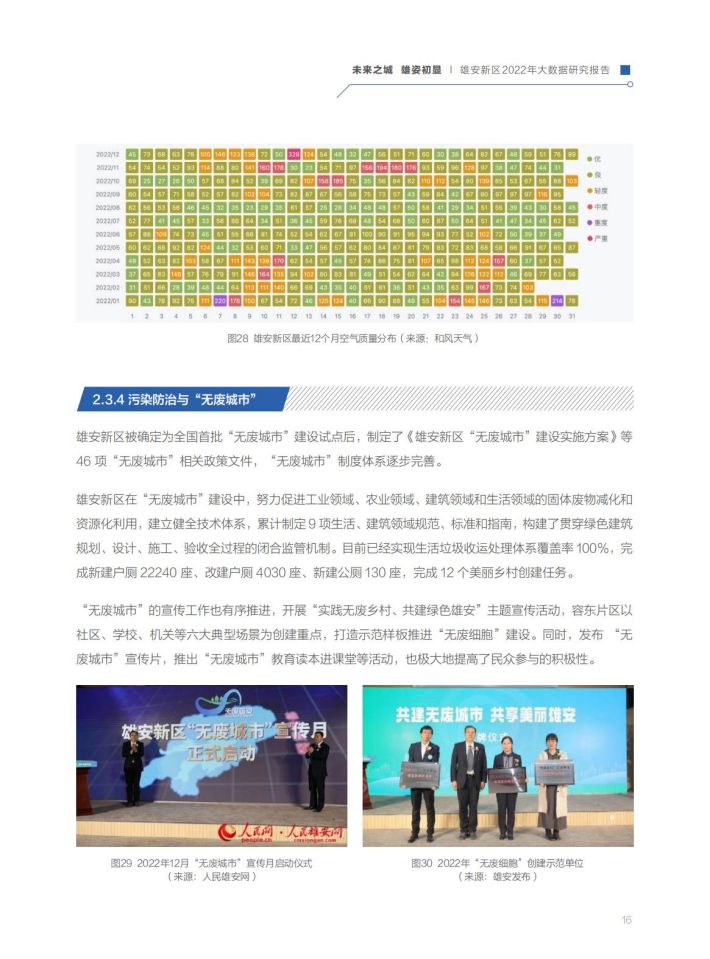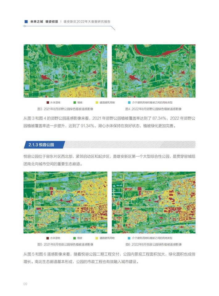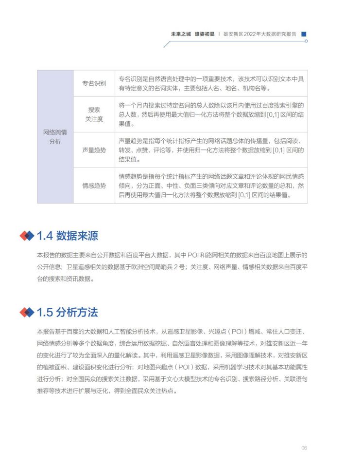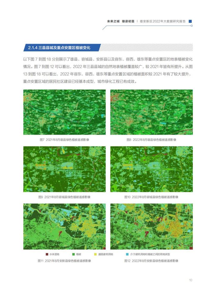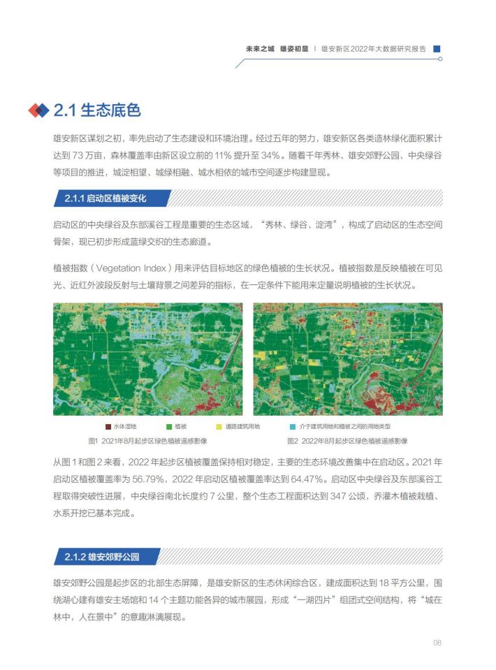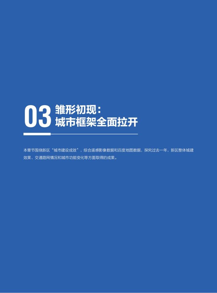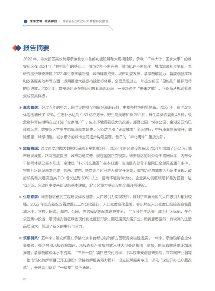 雛形初现:通过百度地图大数据和遥感卫星影像分析,2022年新区建设面积比2021年增加了58.1%,城市建设成型、路网密度提级、城市功能完善,规划藍图正变现实。雄安新区的对外骨干路网体系、内部骨干路网体系已基本形成,京津雄“1小时交通圈”基本打通,启动区内部骨干路网已全部具备通车条件。容东片区建设基本完成,容西、雄东、昝岗等片区已进入穩定开发期。城市功能与城市活力逐步显现,政府机构和交通设施类POI增长达到50%以上,营商环境持续优化,企业类功能区域增长最为显著,达13.3%。启动区主要基础设施基本建成,起步区重大基础设施全面开展建设。