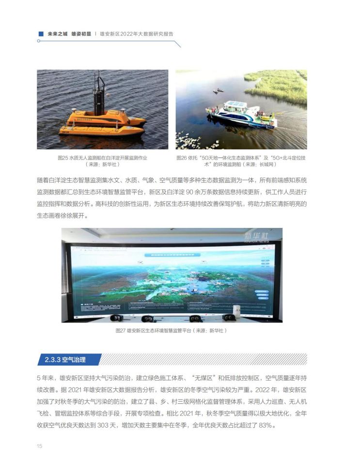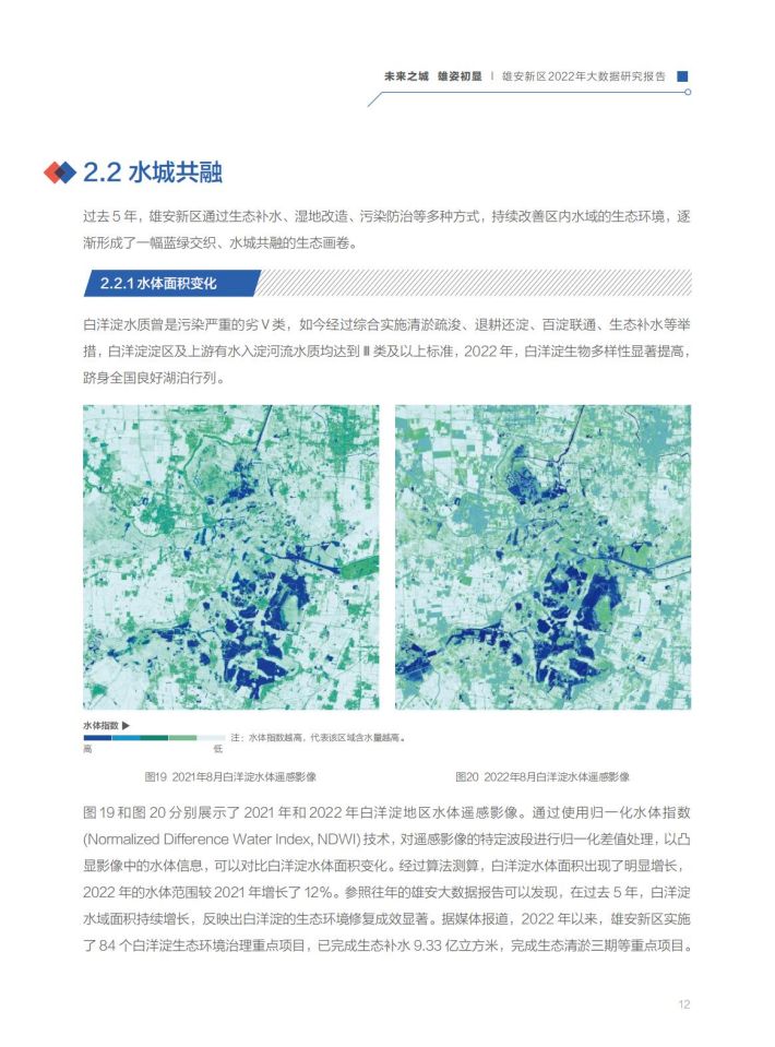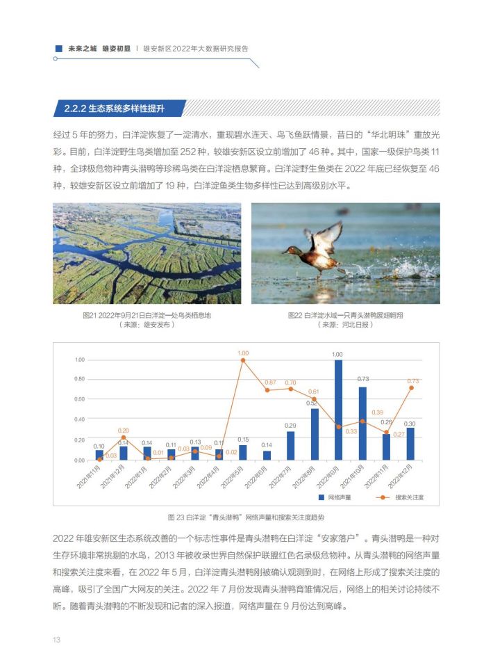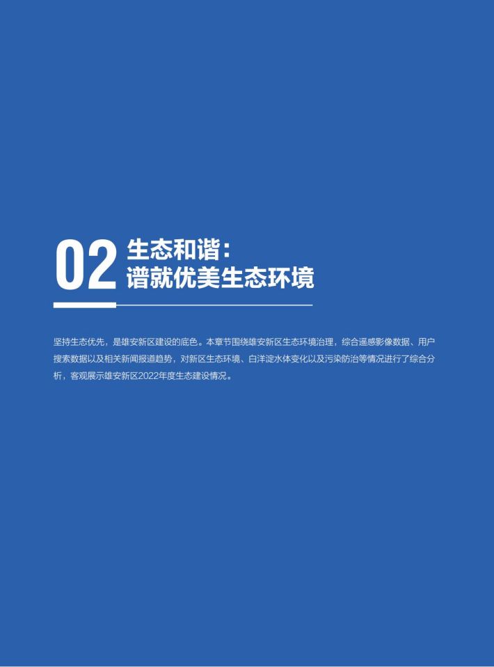生态和谐:经过五年的努力,白洋淀跻身全国良好湖泊行列,生物多样性明显提高。2022年,白洋淀水体范围增长了12%,生态补水达到9.33亿立方米,野生鸟类增加至252种,野生鱼类恢复至46种,极危物种青头潜鸭在白洋淀“安家落户”,生态环境得到极大的改善。郊野公园、悦容公园、金湖公园均已建成运营,雄安新区主要生态廊道基本建成。污染防治和“无废城市”全面推行,空气质量显著提升。城淀相望、城绿相融、城水相依的城市空间逐步构建显现,昔日的“华北明珠”重放光彩。