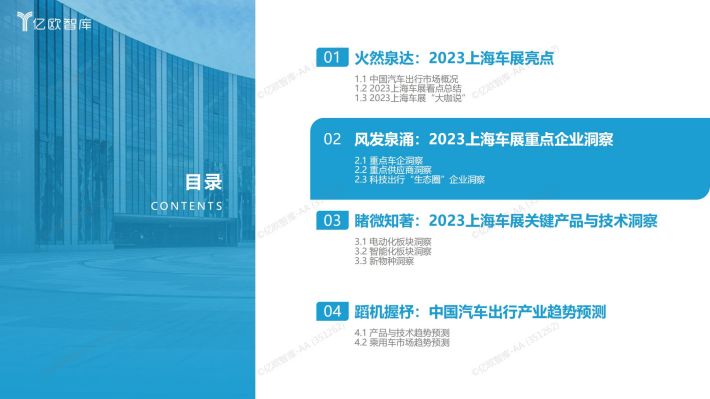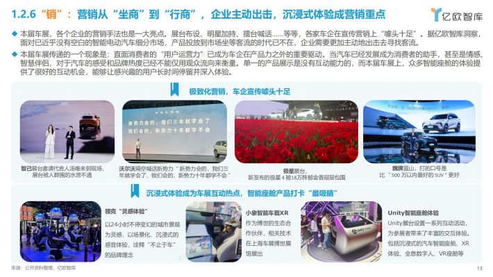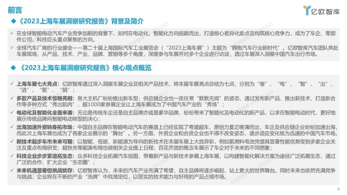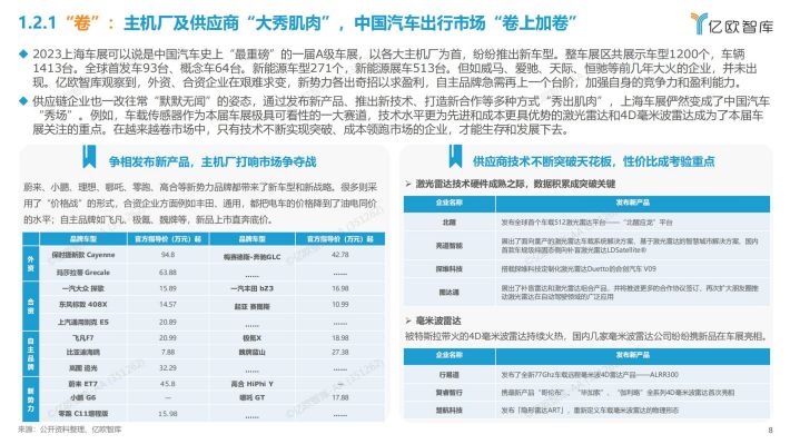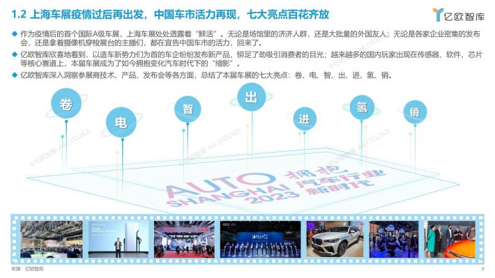 上海车展七大亮点:亿欧智库通过深入洞察车展企业及相关产品技术,将本届车展亮点总结为七点,分别为“卷”、 “电”、 “智”、 “出”、“进”、 “氢”、“销”;