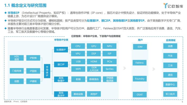 随着半导体行业高度垂直分化发展,半导体IP的用户可分为IDM、晶圆代工厂、Fabless及OSAT四大类型,并广泛落地应用于消费、通信、汽车、工业、军工航天及数据中心等细分领域。