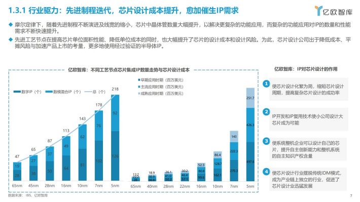 摩尔定律下,随着先进制程不断演进及线宽的缩小,芯片中晶体管数量大幅提升,以解决更复杂的功能应用,而复杂的功能应用对IP的数量和性能需求不断快速提升。