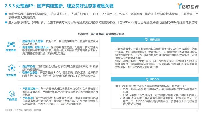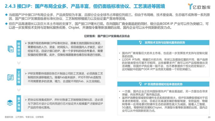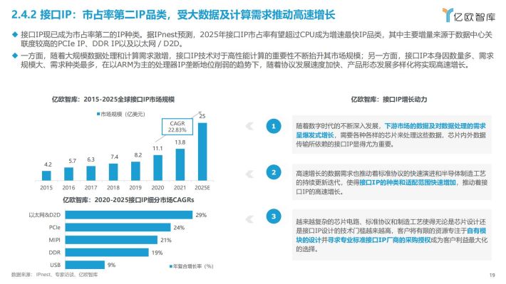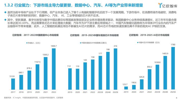 其中,受新基建、数字化转型与数字中国远景目标等国家政策促进及企业将本增效需求驱动,我国数据中心业务持续高速增长,近三年年均复合增长率达到30.69%,而这需要各式芯片来处理庞大数据;汽车作为IP下游主要应用领域之一,中国汽车智能化趋势将为半导体IP行业在内的汽车产业链各环节带来增量;此外,人工智能的拓展应用也不断催生AI芯片的需求,而AI芯片市场的快速发展也离不开新的相关AIIP核的支撑。