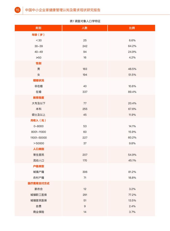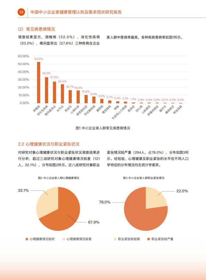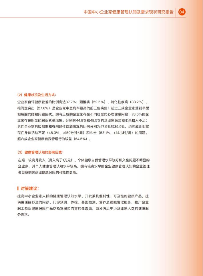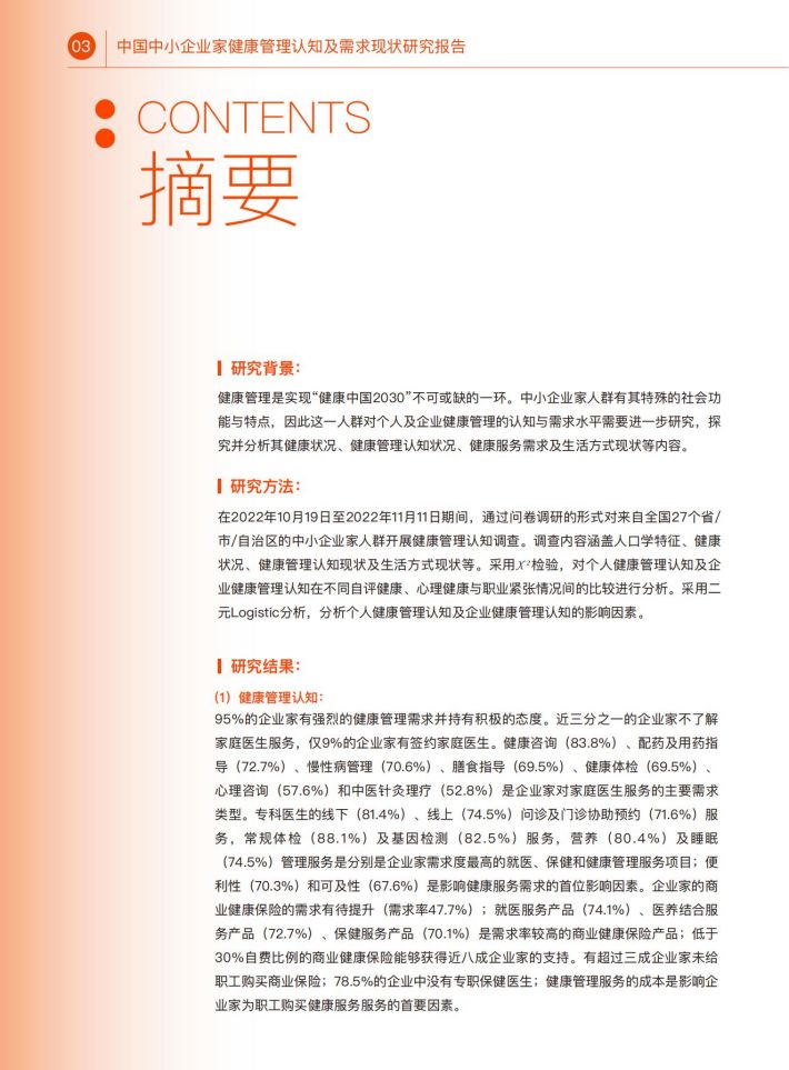 在我国,中小企业是社会经济发展、创新创业的重要载体,在社会中起到了举足轻重的作用。然而,作为企业“掌能人”的中小企业家人群,其健康水平、健康管理认知情况及健康服务需求却缺乏相应调查研究。探究该人群的键康管理认知情况与需求,不仅可以提升该人群自身健康水平与健康素养,同时也能够提升其企业健康管理水平,进一步提升中小企业员工的健康水平,产生更大的社会影响。因此,本研究通过全国范围的线上线下调查,了解中小企业家人群的健康管理认知现状、健康服务需求及其影响因素,为探索提升中小企业家健康管理水平提供科学依据。