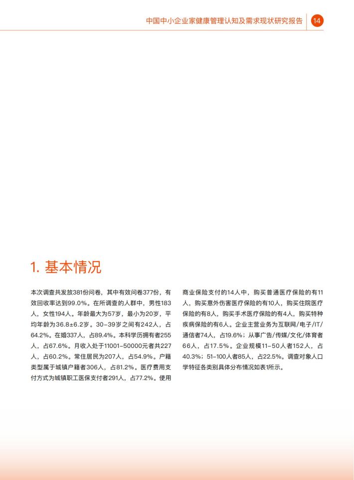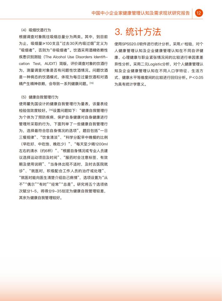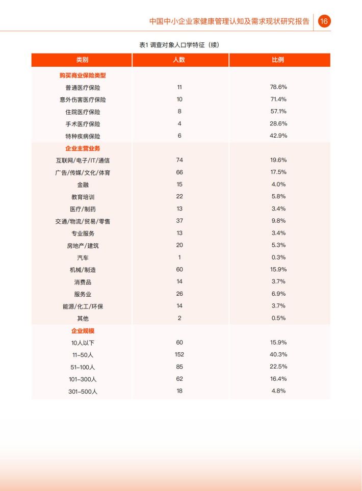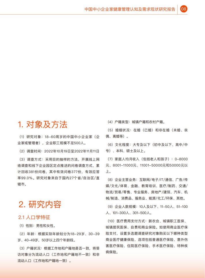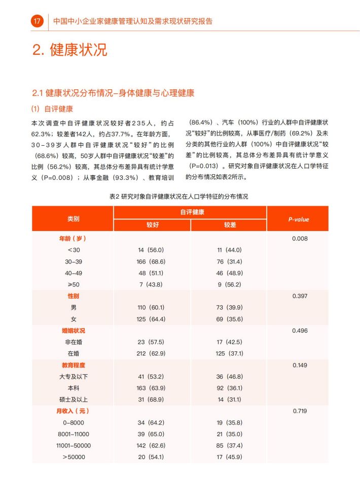 在我国,中小企业是社会经济发展、创新创业的重要载体,在社会中起到了举足轻重的作用。然而,作为企业“掌能人”的中小企业家人群,其健康水平、健康管理认知情况及健康服务需求却缺乏相应调查研究。探究该人群的键康管理认知情况与需求,不仅可以提升该人群自身健康水平与健康素养,同时也能够提升其企业健康管理水平,进一步提升中小企业员工的健康水平,产生更大的社会影响。因此,本研究通过全国范围的线上线下调查,了解中小企业家人群的健康管理认知现状、健康服务需求及其影响因素,为探索提升中小企业家健康管理水平提供科学依据。