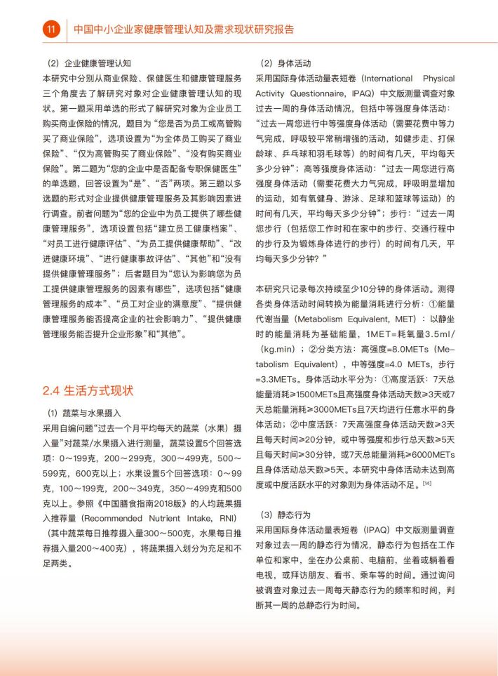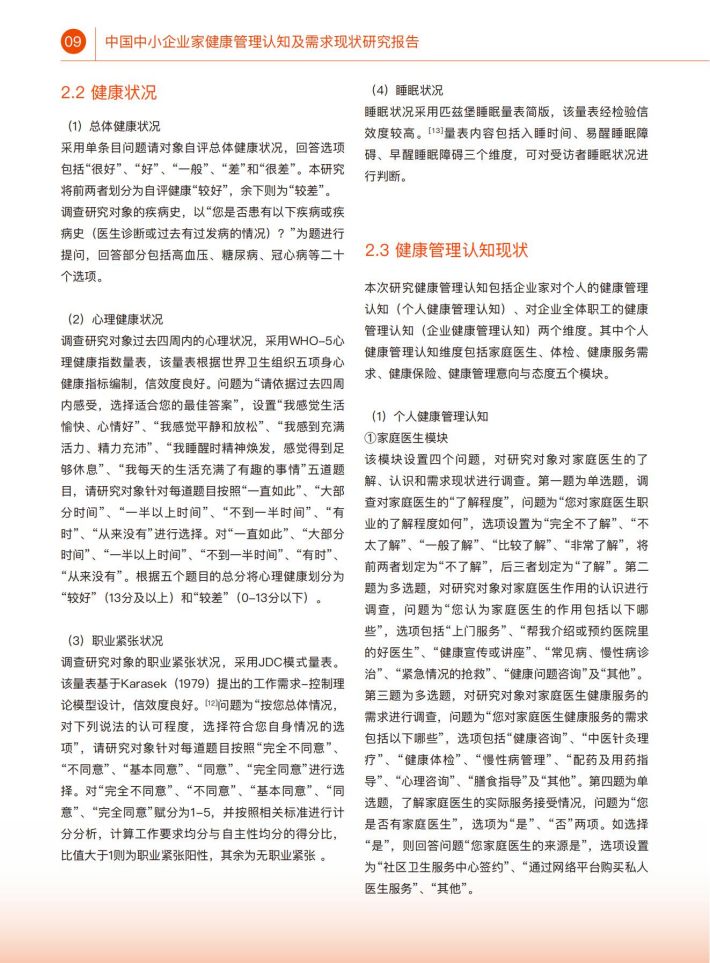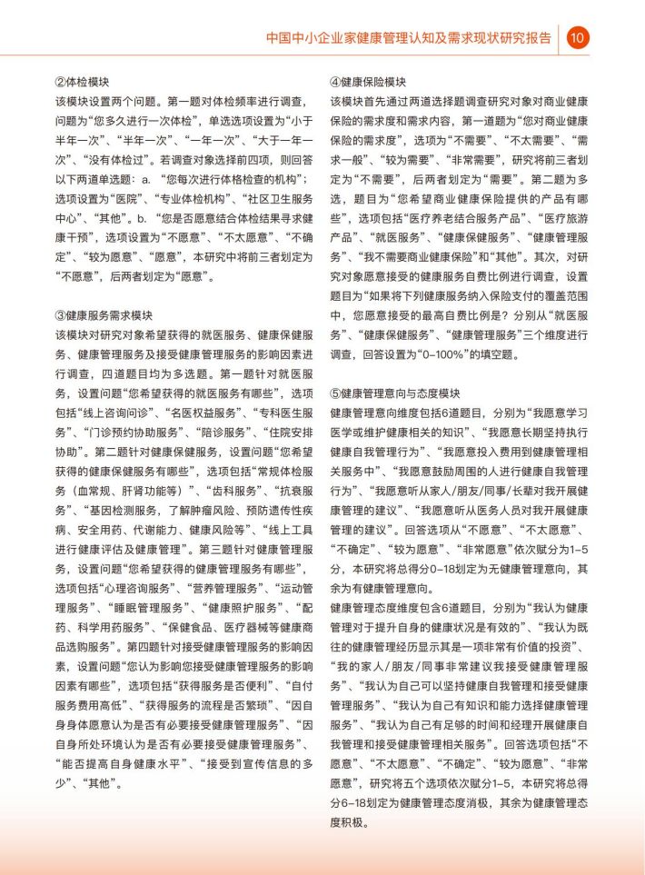 本研究重点关注中小企业家健康管理认知水平相关情况,以及身心健康现状及健康生活方式现状。健康管理认知水平包括个人健康管理认知和企业健康管理认知两个维度。个人健康管理认知包括家庭医生、体检、健康服务、健康保险和健康管理意向与态度五个模块。身心键康状况包含自评健康、常见慢性病思病情况、心理健康、职业累张和睡眠状况。生活方式通盖蔬果摄入、身体活动、静态行为、吸烟饮酒、健康管理行为等内容。