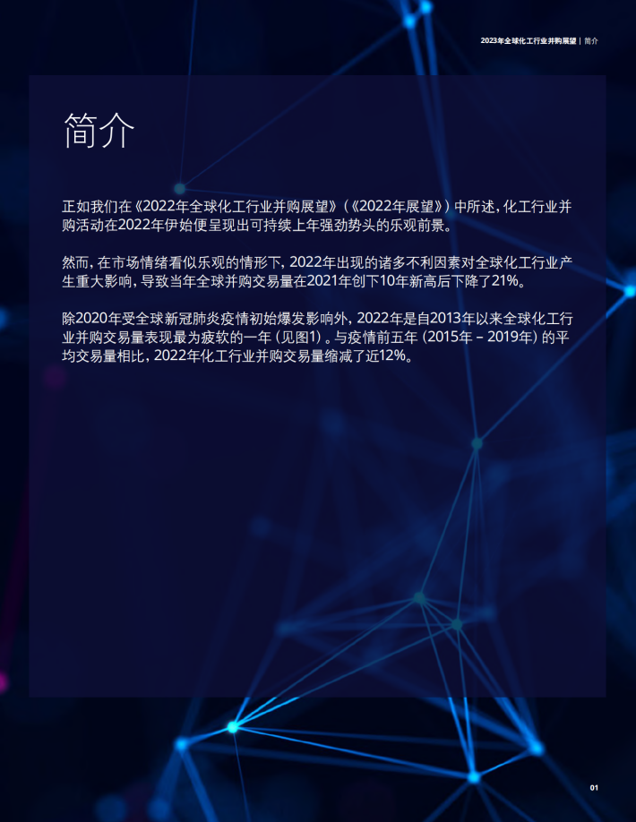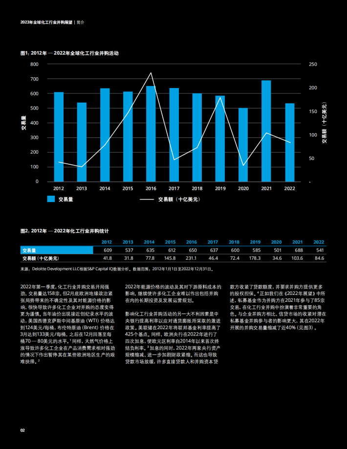 2022年第一季度,化工行业并购交易开局强劲,交易量达158宗,但2月底欧洲地缘政治紧张局势带来的不确定性及其对能源价格的影响,很快导致许多化工企业对并购的态度变得更为谨慎。当年油价出现接近创纪录水平的波动,美国西德克萨斯中间基原油(WTI)价格达到124美元/每桶,布伦特原油(Brent)价格在3月达到133美元/每桶,之后在12月回落至每桶70—80美元的水平。'同样,天然气价格上涨导致许多化工企业在产品消费需求相对强劲的情况下作出暂停其在某些欧洲地区生产的艰难抉择。