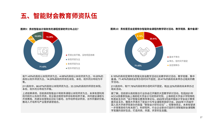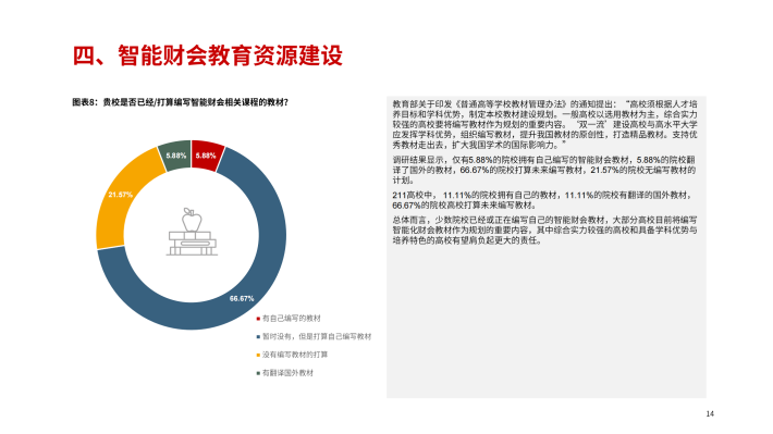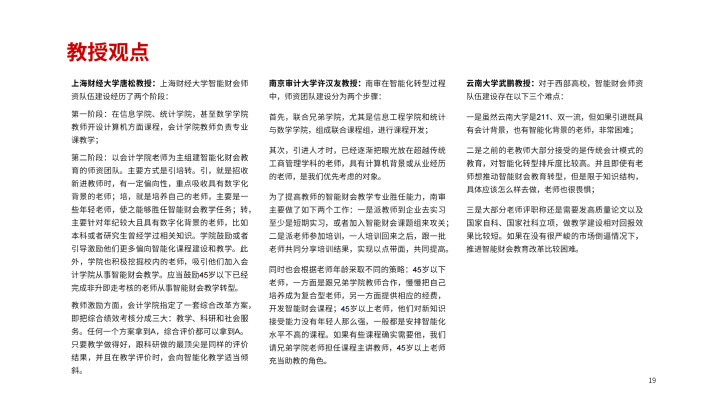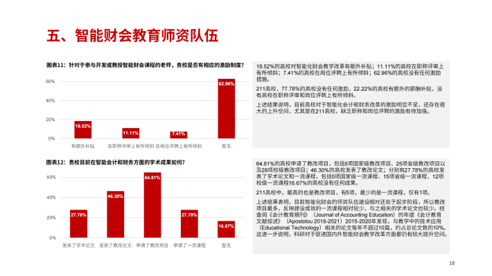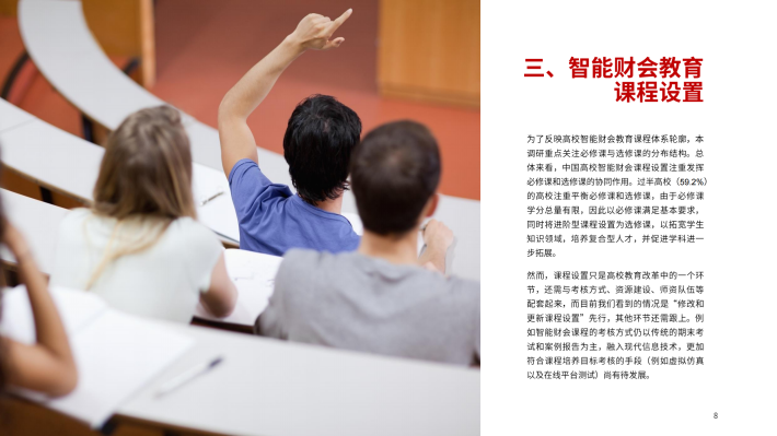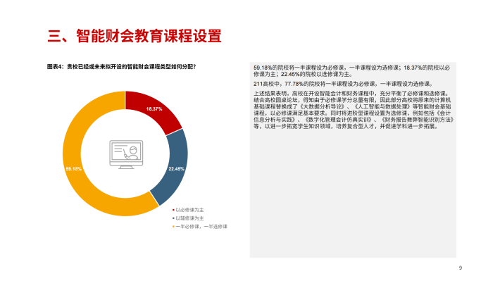 向;35.19%的院校虽然尚未开设智能财会的专门招生方向,但已在部分课程中嵌入相关智能财会的课程;仅有9.26%院校尚未启动智能会计和会计改革。