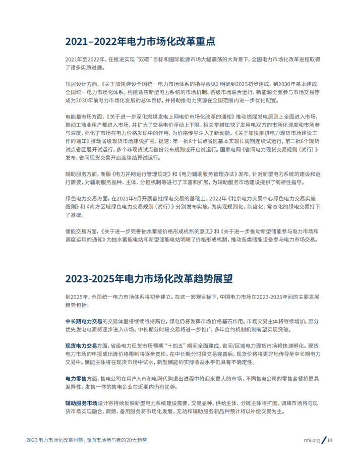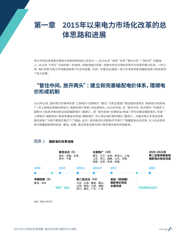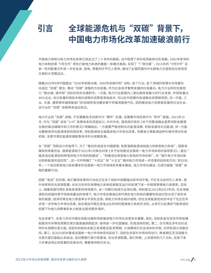 中国电力体制与电力市场化改革已经走过了二十多年的路程,迄今取得了多阶段突破和切实进展。2002年发布的电力体制改革“5号文件”率先打破电力系统的垂直一体模式格局,实现了“厂网分离”;2015年的“9号文件”及其一系列配套文件进一步在批发、配电、零售的环节引入宽争,推动了全国范围内中长期电力交易常态化和现货交易的大范围试点。