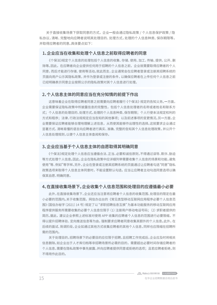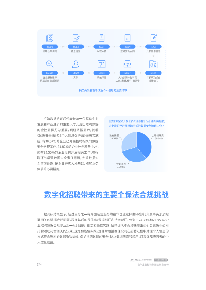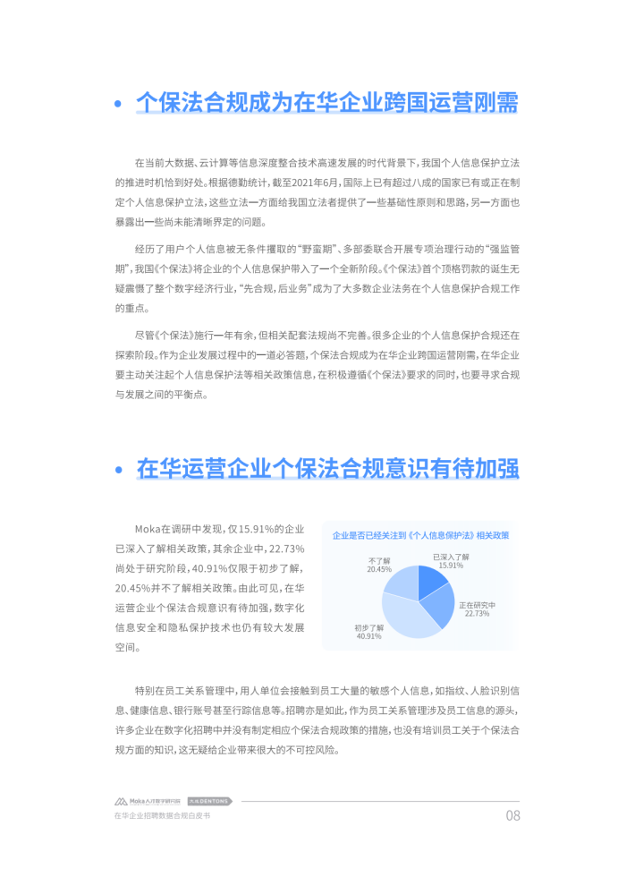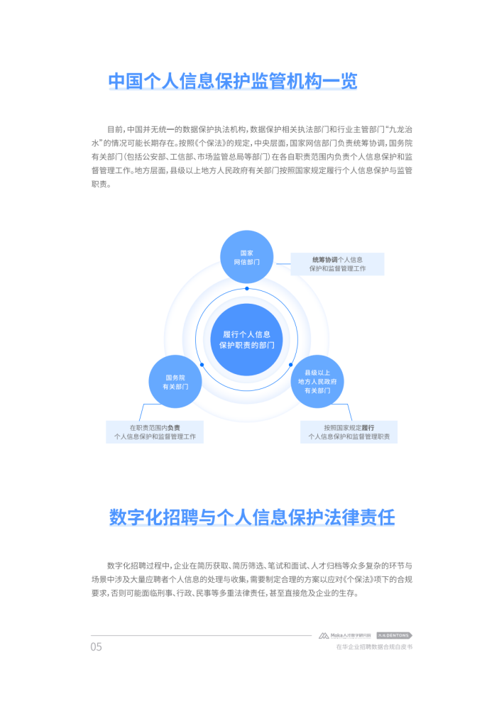 加强个人信息与数据保护也被提升至新高度,一系列法规与政策措施陆续出台以加强数据保护。在提升自身数字化能力、加强数字化转型以应对日益激烈的市场竞争时,企业在数据收集、数据传输等诸多环节也产生了法律合规需求。由于人力资源管理不仅是企业管理体系的核心功能,也是获得持续竞争力的关键所在,很多企业都将人力资源管理数字化转型与个人信息保护和数据安全管理提升至新的高度。对此,本白皮书从企业人力资源管理需求出发,以近年来我国个人信息和数据保护相关政策法规的最新发展为视角,对在华企业数字化招聘面临的合规困境进行了深度分析,并结合法律实务和技术实践提供了相应参考建议。