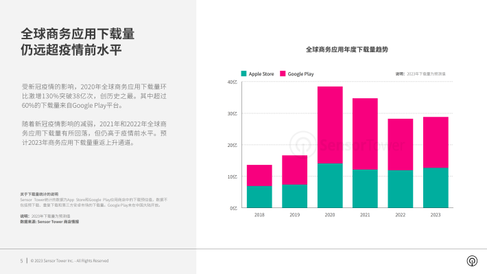随着新冠疫情影响的减弱,2021年和2022年全球商务应用下载量有所回落,但仍高于疫情前水平。预计2023年商务应用下载量重返上升通道。