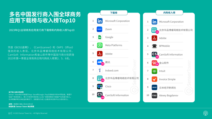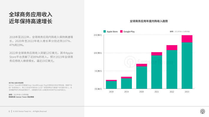 2022年全球商务应用收入突破12亿美元,其中AppleStore平台贡献了近89%的收入。预计2023年全球商务应用收入继续增长,逼近15亿美元。