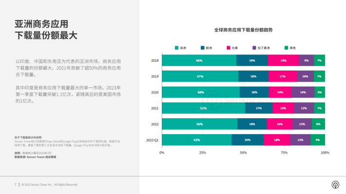 以印度、中国和东南亚为代表的亚洲市场,商务应用下载量的份额最大,2021年贡献了超50%的商务应用总下载量。