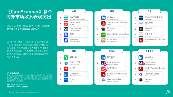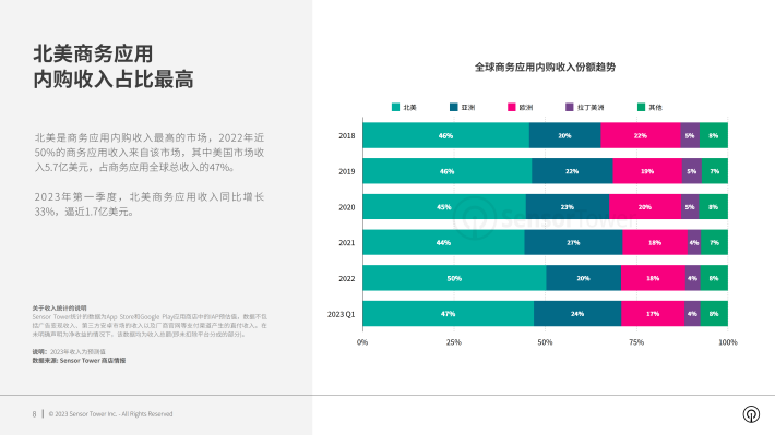 北美是商务应用内购收入最高的市场,2022年近50%的商务应用收入来自该市场,其中美国市场收入5.7亿美元,占商务应用全球总收入的47%。