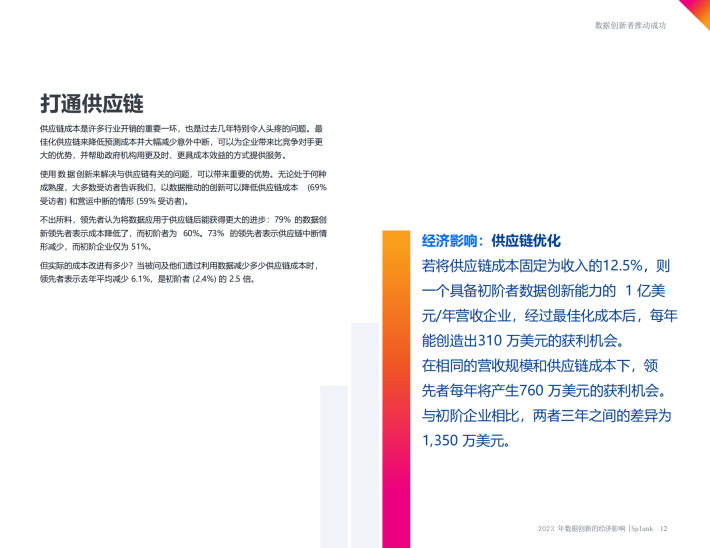 不出所料,领先者认为将数据应用于供应链后能获得更大的进步:79%的数据创新领先者表示成本降低了,而初阶者为60%。73%的领先者表示供应链中断情形减少,而初阶企业仅为51%。