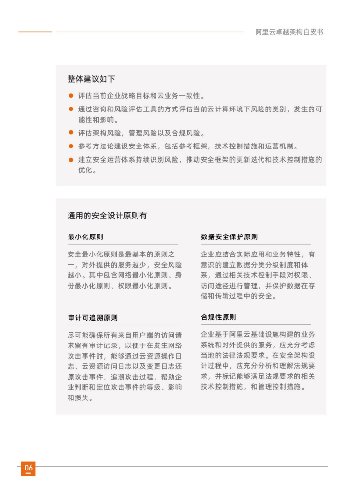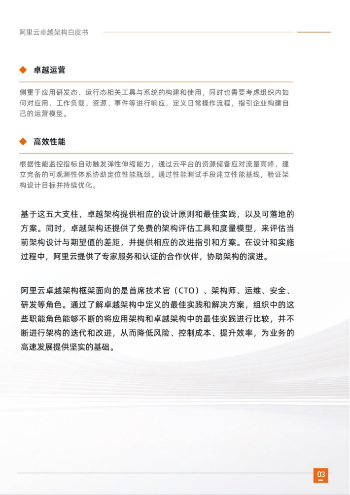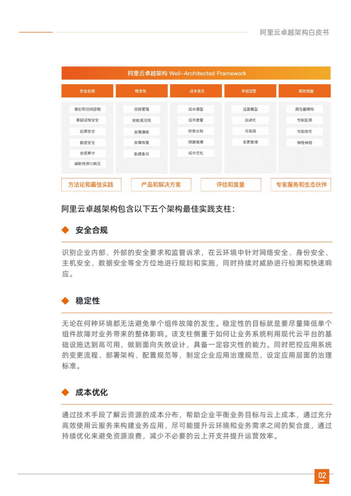 相比于传统IDC环境,云计算的基础设施和服务在不断快速迭代和演进,对云用户而言,在上云、用云、管云过程中持续维持良好的云上架构变得极具挑战。对云上应用来说,稳定、安全、性能、成本是架构设计中最通用领域的抽象,也是组织层面最需要关注的几个维度。基于多年服务各行各业客户的经验总结,我们将阿里云上的架构设计最佳实践总结为一系列的方法论和设计原则,形成阿里云卓越架构框架(Alibaba Cloud Well-Architected Frame-work),以帮助云用户构建良好直至卓越的云上架构。