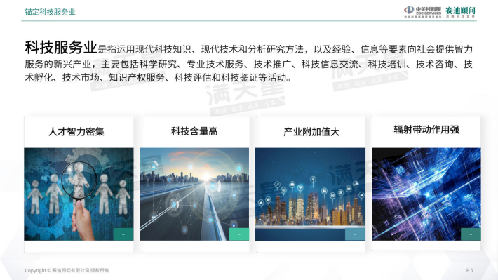 科技服务业是指运用现代科技知识、现代技术和分析研究方法,以及经验、信息等要素向社会提供智力服务的新兴产业,主要包括科学研究、专业技术服务、技术推广、科技信息交流、科技培训、技术咨询、技术孵化、技术市场、知识产权服务、科技评估和科技鉴证等活动。