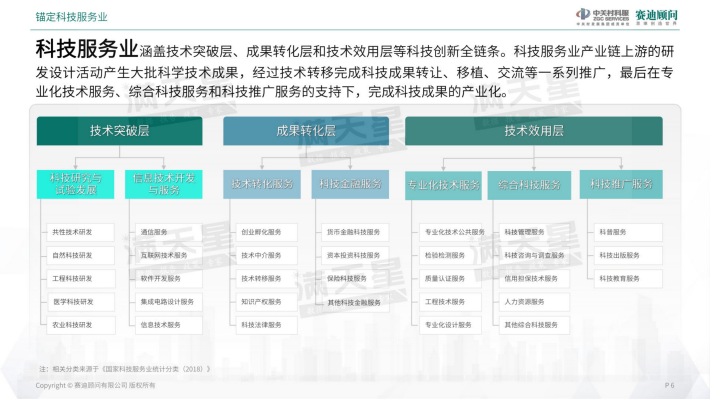 科技服务业涵盖技术突破层、成果转化层和技术效用层等科技创新全链条。科技服务业产业链上游的研发设计活动产生大批科学技术成果,经过技术转移完成科技成果转让、移植、交流等一系列推广,最后在专业化技术服务、综合科技服务和科技推广服务的支持下,完成科技成果的产业化。