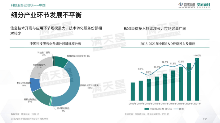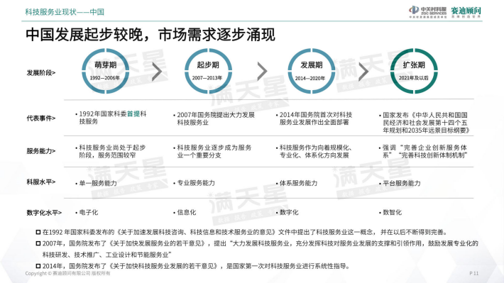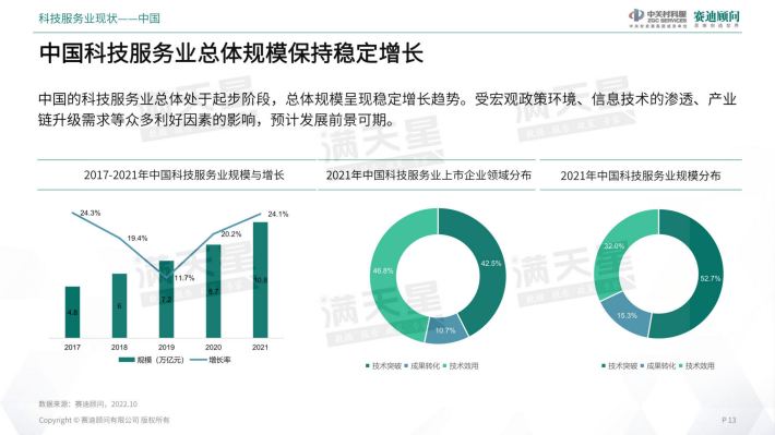 中国的科技服务业总体处于起步阶段,总体规模呈现稳定增长趋势。受宏观政策环境、信息技术的渗透、产业链升级需求等众多利好因素的影响,预计发展前景可期。