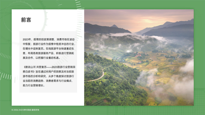 《数说山河共营复苏——2023旅游行业营销洞察白皮书》旨在通过对用户的洞察及对当前旅游市场的分析和研究,从多个角度探讨旅游行业当前的消费趋势、消费者需求与行业痛点,助力行业营销增长。