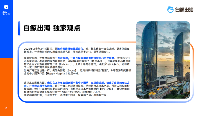 2023年上半年2个关键词,是追求卷素材和品质进化。卷,其实代表一直在追新,更多体现在增长上,一些老游戏的应用成绩尤其亮眼,而追求品类进化,则更强调专注。