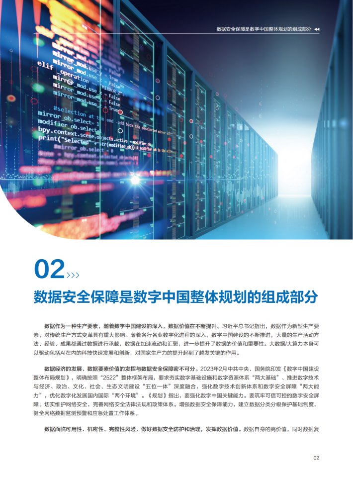 数据经济的发展、数据要素价值的发挥与数据安全保障密不可分。2023年2月中共中央、国务院印发《数字中国建设整体布局规划》,明确按照“2522”整体框架布局,要求夯实数字基础设施和数字资源体系“两大基础”、推进数字技术与经济、政治、文化、社会、生态文明建设“五位一体”深度融合,强化数字技术创新体系和数字安全屏障“两大能力”,优化数字化发展国内国际“两个环境”。《规划》指出,要强化数字中国关键能力。要筑牢可信可控的数字安全屏障。切实维护网络安全,完善网络安全法律法规和政策体系。增强数据安全保障能力,建立数据分类分级保护基础制度,健全网络数据监测预警和应急处置工作体系。