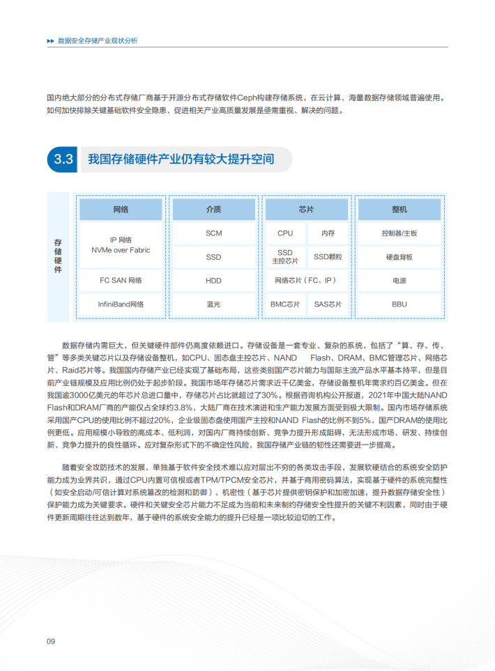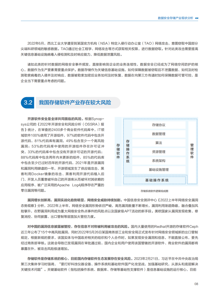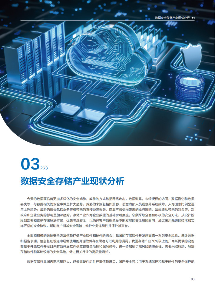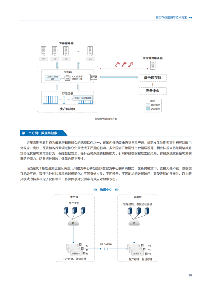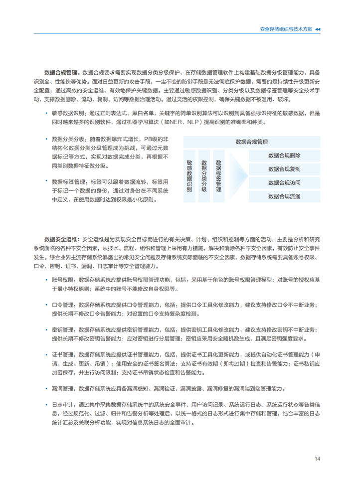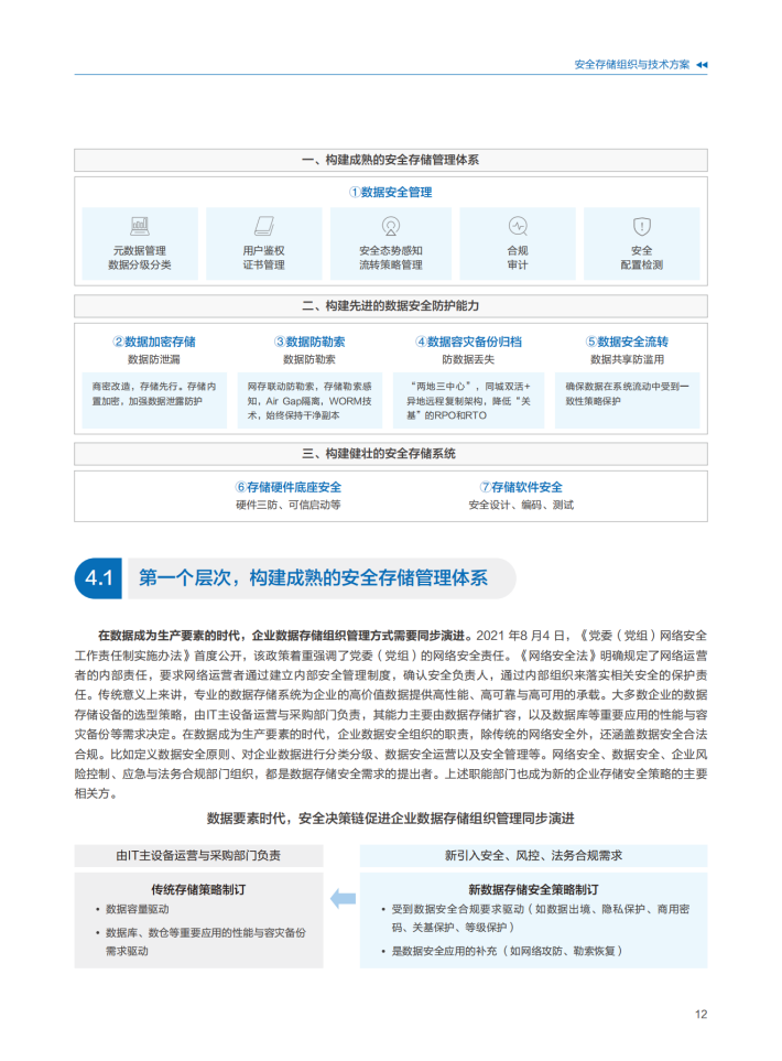 数据面临可用性、机密性、完整性风险,做好数据安全防护和治理,发挥数据价值。数据自身的高价值,同时数据复制的低成本给数据防护带来很大的挑战,客户担心数据安全风险也是导致数据价值难以充分释放的原因之一。在确保数据安全合规的前提下,利用技术创新,加速数据流动与交易已经成为迫切的需求。数据要素的全生命周期安全,数据存储设备在数据的机密性、可用性保障方面的作用不可替代,数据存储安全能力提升是加强数据安全防护水平,提升数据安全治理效率技术体系的重要组成部分。
