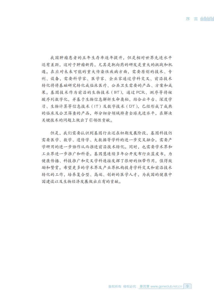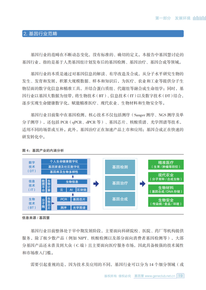 我国肿瘤患者的五年生存率逐年提升,但是相对世界先进水平还有差距,这对于肿瘤新药,尤其是靶向药的研发是重大的挑战和机遇。在应对未来可能的重大传染性疾病方面,需要原创的技术、专利、设备,需要科学家、医学家、企业家通过学科交叉、前沿技术转化将将基础研究转化成临床医疗、公共卫生需要的产品、方案和成果。基因技术作为前沿的生物技术(BT),通过PCR、测序等将核酸序列数字化,并基于生物信息解析生命奥秘,结合云平台、深度学习、生物计算等信息技术(IT)及数字技术(DT),已经形成了成熟的临床及公卫筛查的产品,部分细分领域跻身全球先进水平,在解决关键技术的问题上做出了引领性贡献。
