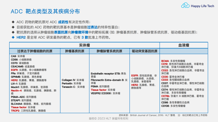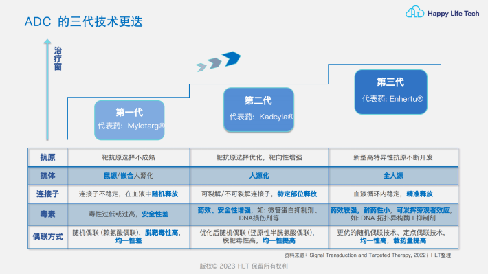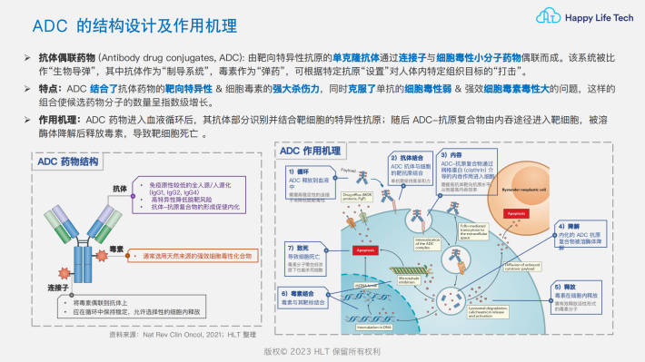 抗体偶联药物(Antibody drug conjugates,ADC):由靶向特异性抗原的单克隆抗体通过连接子与细胞毒性小分子药物偶联而成。该系统被比作“生物导弹”,其中抗体作为“制导系统”,毒素作为“弹药”,可根据特定抗原“设置”对人体内特定组织目标的“打击”。
