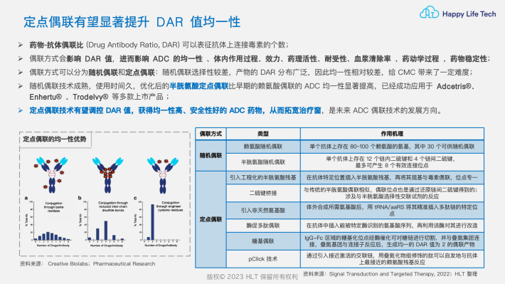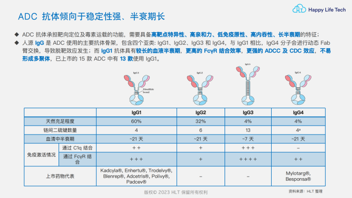 ADC抗体承担靶向定位及毒素运载的功能,需要具备高靶点特异性、高亲和力、低免疫原性、高内吞性、长半衰期的特征;人源lgG是ADC使用的主要抗体骨架,包含四个亚类:lgG1、lgG2、lgG3和lgG4,与lgG1相比,IgG4分子会进行动态Fab臂交换,导致脱靶效应发生;而lgG1抗体具有较长的血液半衰期,更高的FcyR结合效率,更强的ADCC及CDC效应,不易形成多聚体,已上市的15款ADC中有13款使用lgG1。