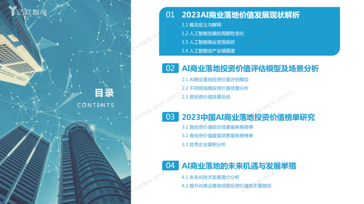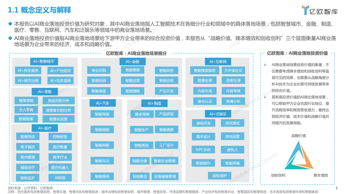 本报告以AI商业落地投资价值为研究对象,其中AI商业落地指人工智能技术在各细分行业和领域中的具体落地场景,包括智慧城市、金融、制造、医疗、零售、互联网、汽车和泛娱乐等领域中的商业落地场景。