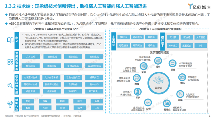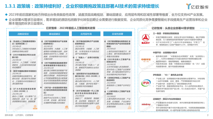 基于技术成熟度曲线,人工智能领域中计算机视觉、数据标签与注释等成熟度相对较高的技术在现有商业落地场景中应用广泛;以生成式AI为代表的萌芽期技术具有较大发展潜力,有助于提升AI技术落地的可能性和场景的丰富度。