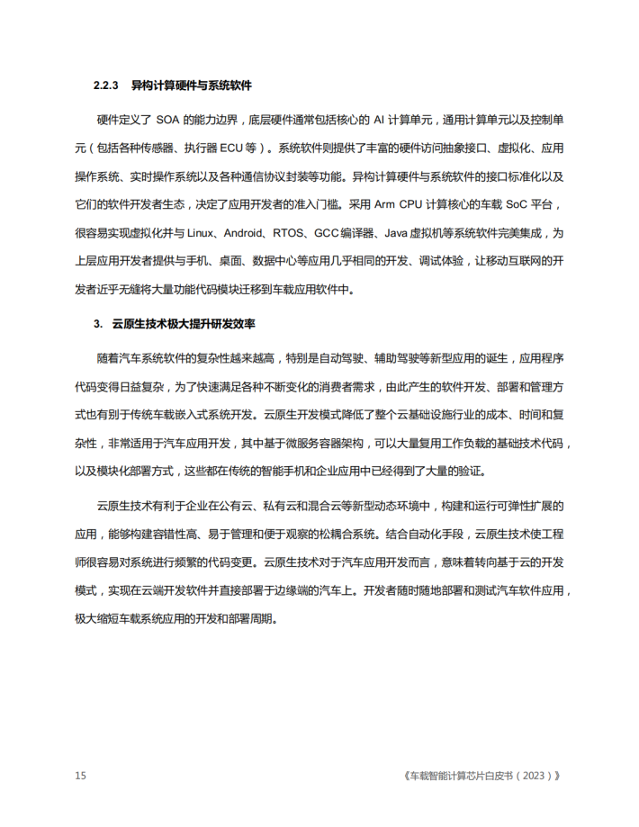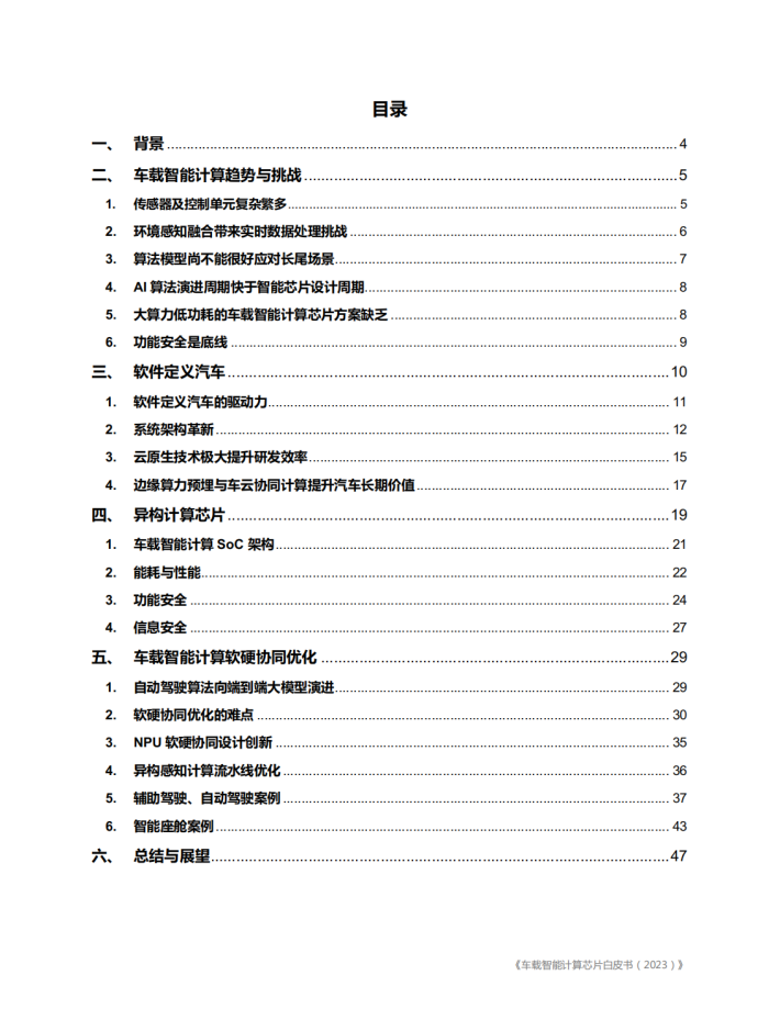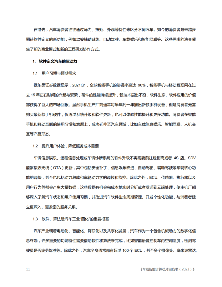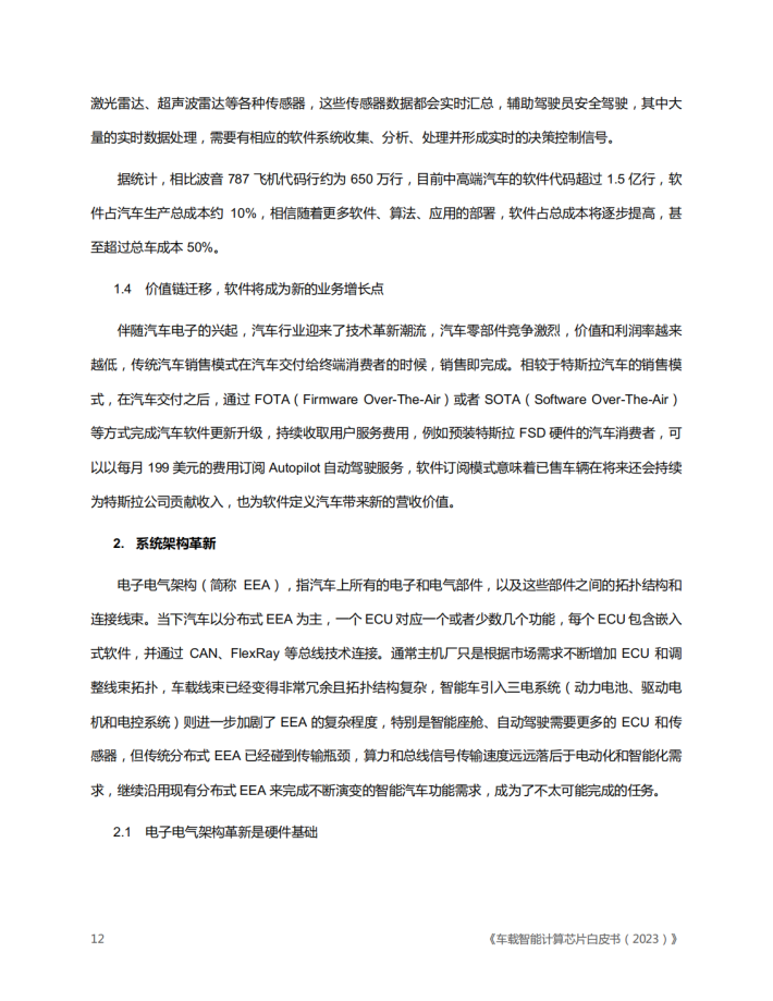 智能化、面向服务的基础架构、软件定义汽车等已经成为各大汽车厂商竞相追逐的热点和差异化的焦点。高算力域控制器、智能座舱、辅助驾驶、自动驾驶等人工智能算法应用越来越受到各大汽车制造商、汽车零部件供应商、算法和系统集成商的重视和关注,并迅速成为投资和竞争的重点。软件和算法在智能驾驶汽车中越来越重要而且成为了差异化竞争的关键。软件价值的提升意味若未来汽车更多的创新将集中在电子和软件部分。领先的底层架构、出色的软件迭代、持续优化和不断进化的硬件技术,将加速整个汽车行业的转型与变革。随着芯片技术、硬件技术、软件技术、人工智能、深度学习算法等迅猛发展,智能计算已是大势所趋,车载智能计算软硬件平台和服务的竞争在汽车行业中将会越来越激烈。