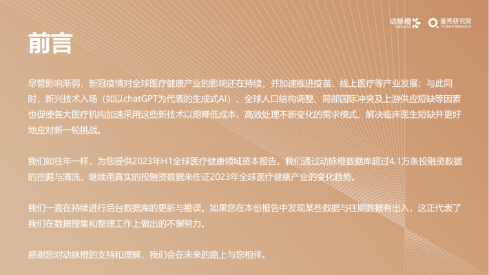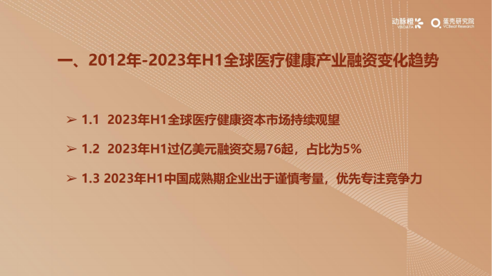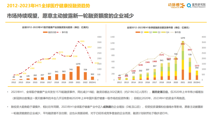 此外,需要指出的是,尽管在融资事件数方面并无优势,但相比往年,医疗服务领域的企业于2023年H1吸引了多笔过亿美元融资,基础医疗保健的需求市场与资本市场保持了同频。