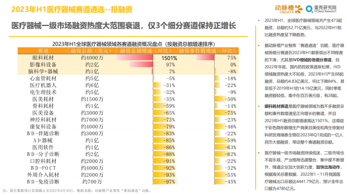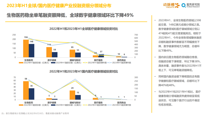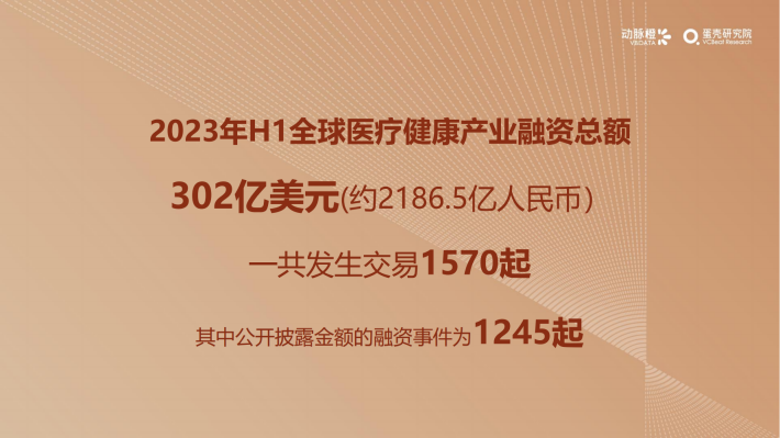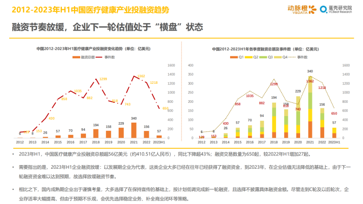 2023年H1,中国医疗健康产业投融资总额超56亿美元(约410.51亿人民币),同比下降超43%;融资交易数量为650起,较2022年H1增加27起。