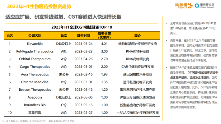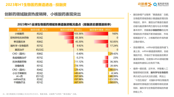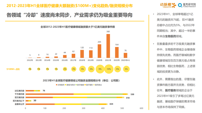 2023年H1,全球单笔超过1亿美元的融资共76起,在H1融资总额中占比约为5%,与2022年同期相当;其中,超过一半的事件来自生物医药领域。