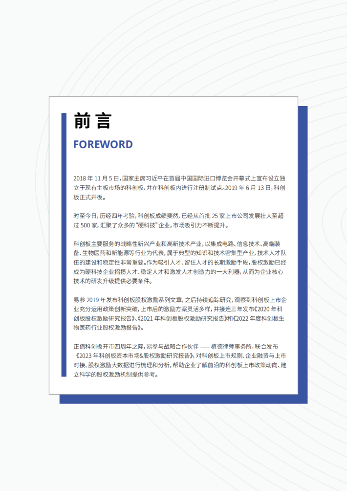 正值科创板开市四周年之际,易参与战略合作伙伴—植德律师事务所,联合发布《2023年科创板资本市场&股权激励研究报告》,对科创板上市规则、企业融资与上市对接、股权激励大数据进行梳理和分析,帮助企业了解前沿的科创板上市政策动向、建立科学的股权激励机制提供参考。