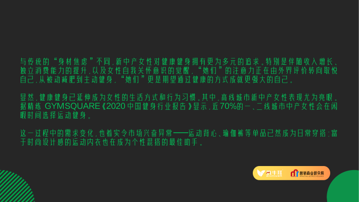 显然,健康健身已延伸成为女性的生活方式和行为习惯。其中,高线城市新中产女性表现尤为亮眼。据精练GYMSQUARE《2020中国健身行业报告》显示,近70%的一、二线城市中产女性会在闲暇时间选择运动健身。