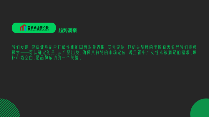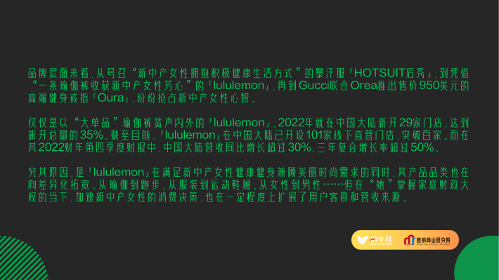 与传统的“身材焦虑”不同,新中产女性对健康健身拥有更为多元的追求。特别是伴随收入增长、独立消费能力的提升,以及女性自我关怀意识的觉醒,“她们”的注意力正在由外界评价转向取悦自己,从被动减肥到主动健身,“她们”更是期望通过健康的方式成就更强大的自己。