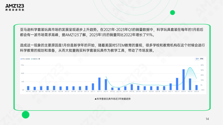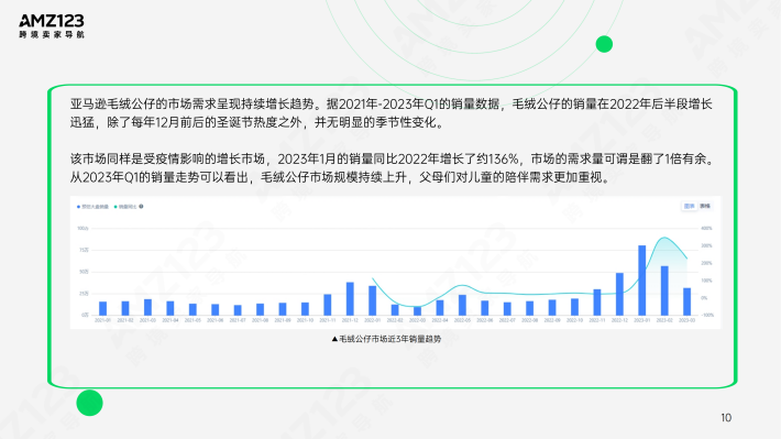 亚马逊毛绒动物市场的发展呈现稳定上升趋势。从2021年-2023年Q1的销量数据中可以看出,毛绒动物在近3年的需求逐年上升,无明显的季节性变化,且每年的12月前后都有一波需求高峰。