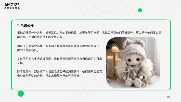 毛绒动物是国内外都比较受儿童欢迎的玩具款式,其受众年龄段覆盖了儿童和青少年群体。对于儿童来说,主要作用是为他们带来欢乐和陪伴,毛绒动物通常是依据真实动物的外形和特征制造,能帮助儿童增加对不同动物的了解。
