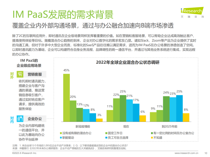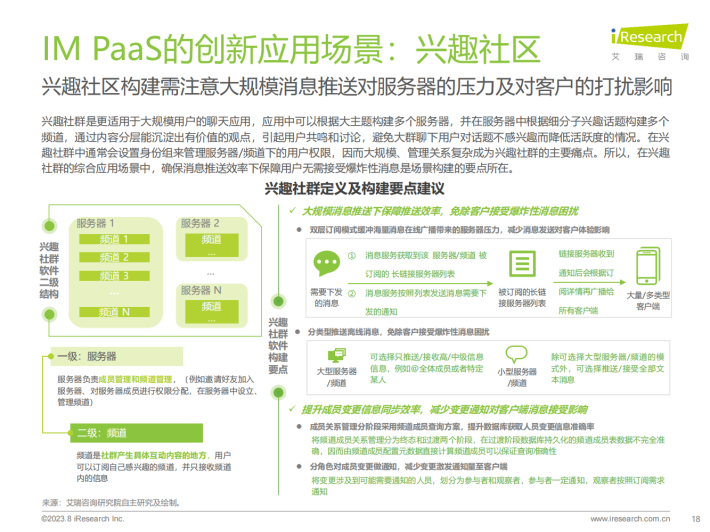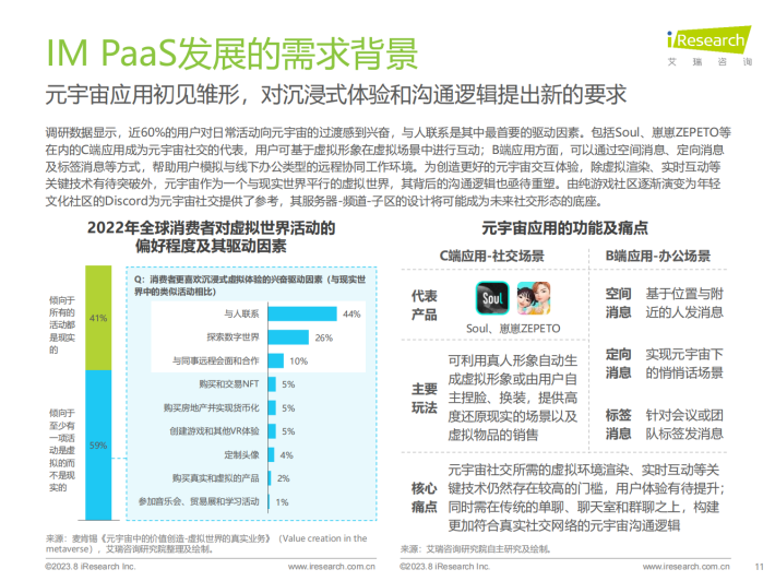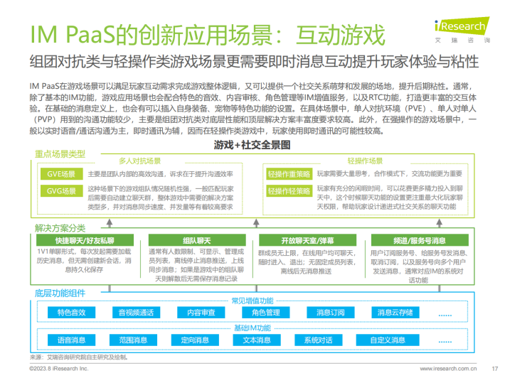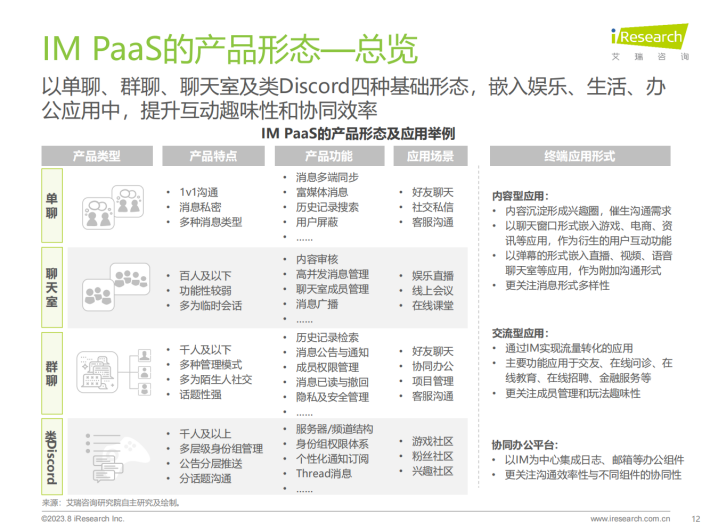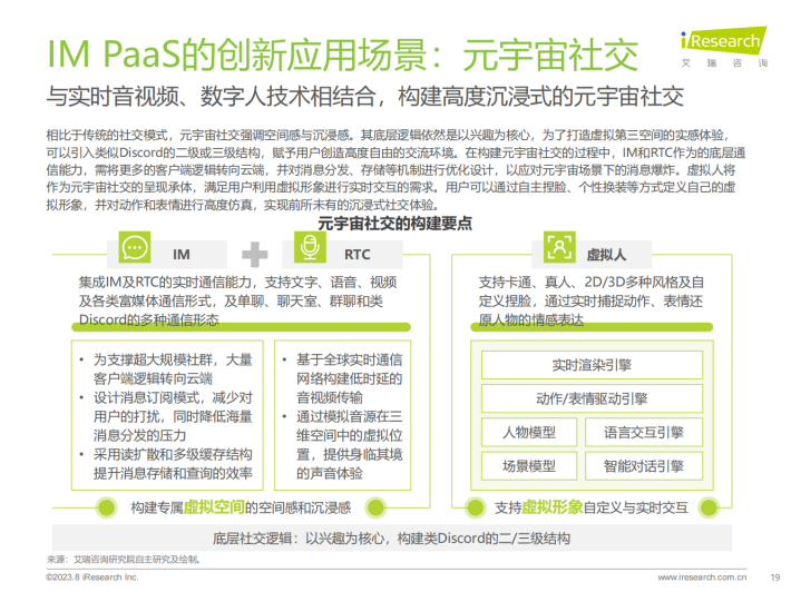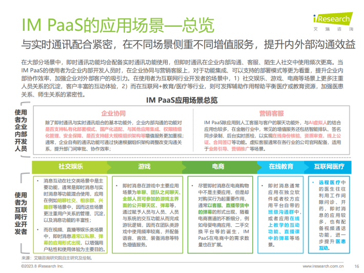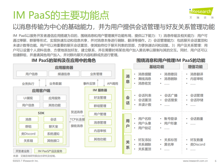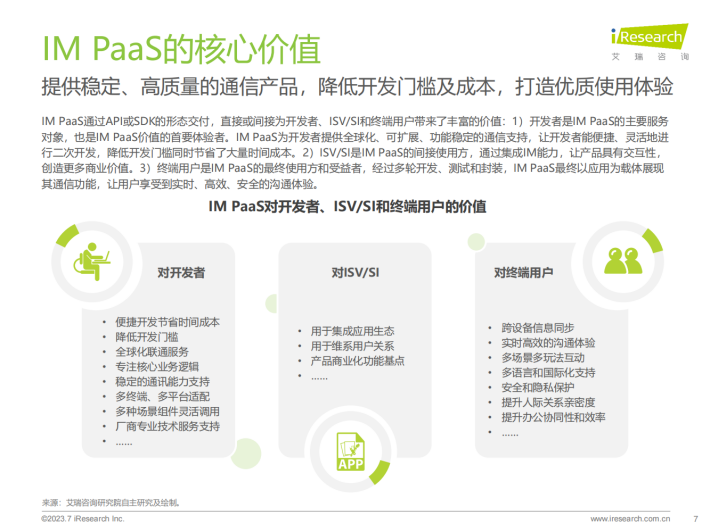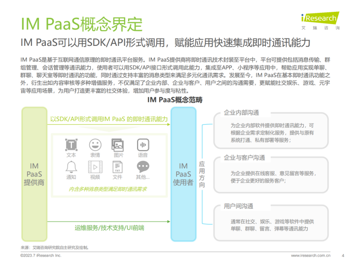 IM PaaS是基于互联网通信原理的即时通讯平台服务。IM PaaS提供商将即时通讯技术封装至平台中,平台可提供包括消息传输、群组管理、会话管理等通讯能力,使用者可以用SDK/API接口形式调用此能力,集成至APP、小程序等应用中,帮助应用实现单聊、群聊、聊天室等即时通讯的功能,同时通过支持丰富的消息类型来满足多元化通讯需求。发展至今,IM PaaS在基本即时通讯功能之外,衍生出如内容审核等多种增值服务,不仅满足了企业内部、企业与客户、用户之间的沟通需要,更赋能社交娱乐、游戏、元宇宙等应用场景,为用户打造更丰富的社交体验,增加用户参与度与粘性。