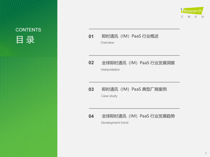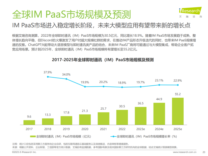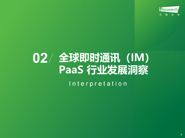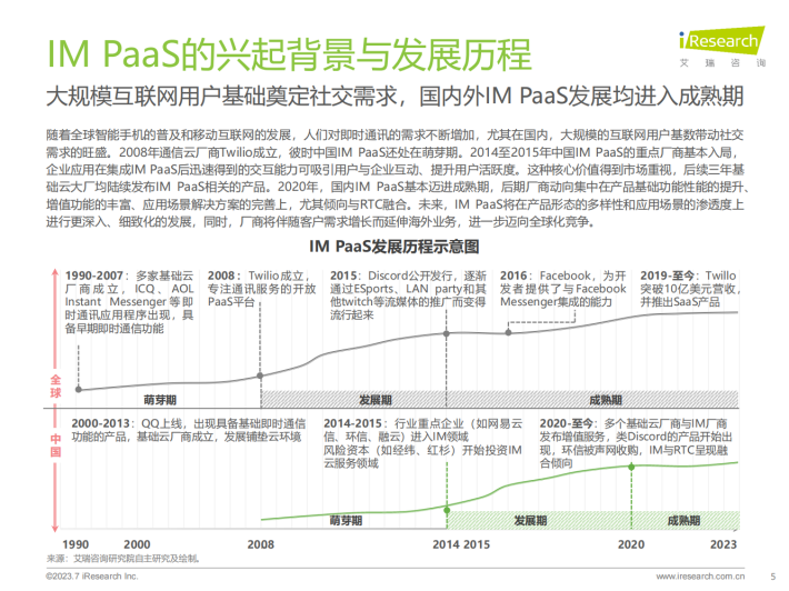 随着全球智能手机的普及和移动互联网的发展,人们对即时通讯的需求不断增加,尤其在国内,大规模的互联网用户基数带动社交需求的旺盛。2008年通信云厂商Twilio成立,彼时中国IM PaaS还处在萌芽期。2014至2015年中国IM PaaS的重点厂商基本入局,企业应用在集成IM PaaS后迅速得到的交互能力可吸引用户与企业互动、提升用户活跃度。这种核心价值得到市场重视,后续三年基础云大厂均陆续发布IM PaaS相关的产品。2020年,国内IM PaaS基本迈进成熟期,后期厂商动向集中在产品基础功能性能的提升、增值功能的丰富、应用场景解决方案的完善上,尤其倾向与RTC融合。未来,IM PaaS将在产品形态的多样性和应用场景的渗透度上进行更深入、细致化的发展,同时,厂商将伴随客户需求增长而延伸海外业务,进一步迈向全球化竞争。
