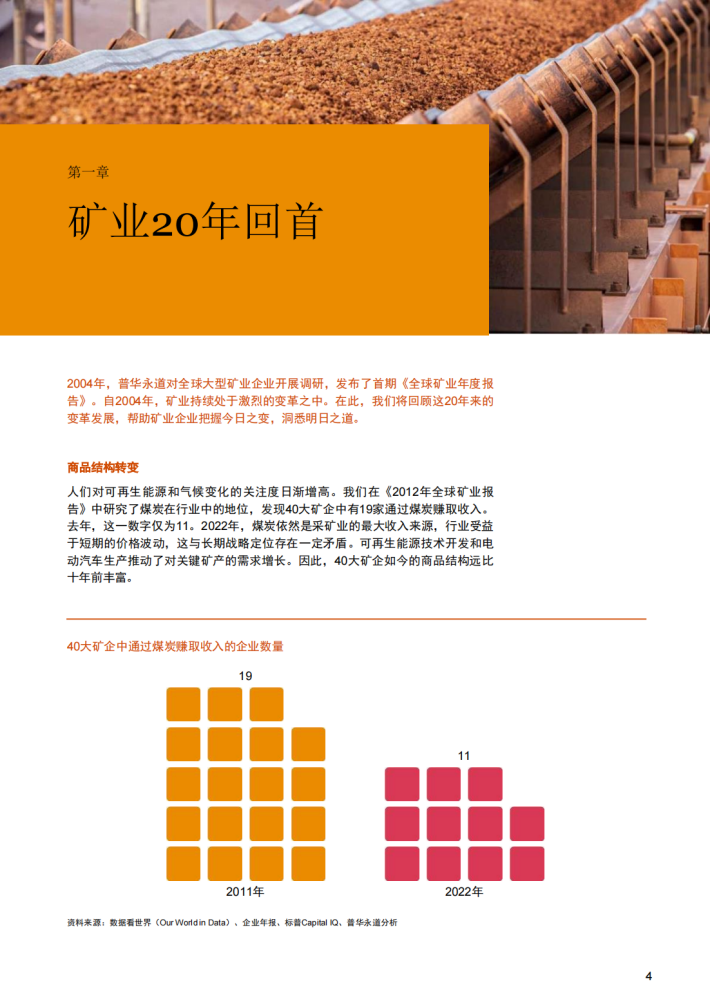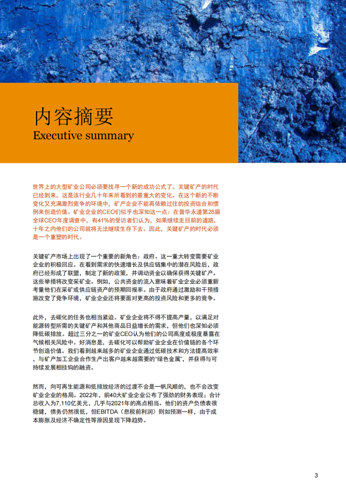 世界上的大型矿业公司必须要找寻一个新的成功公式了。关键矿产的时代已经到来,这是该行业几十年来所看到的最重大的变化。在这个新的不断变化又充满激烈竞争的环境中,矿产企业不能再依赖过往的投资组合和惯例来创造价值。矿业企业的CEO们似乎也深知这一点:在普华永道第26届全球CEO年度调查中,有41%的受访者们认为,如果继续走目前的道路,十年之内他们的公司就将无法继续生存下去。因此,关键矿产的时代必须是一个重塑的时代。
