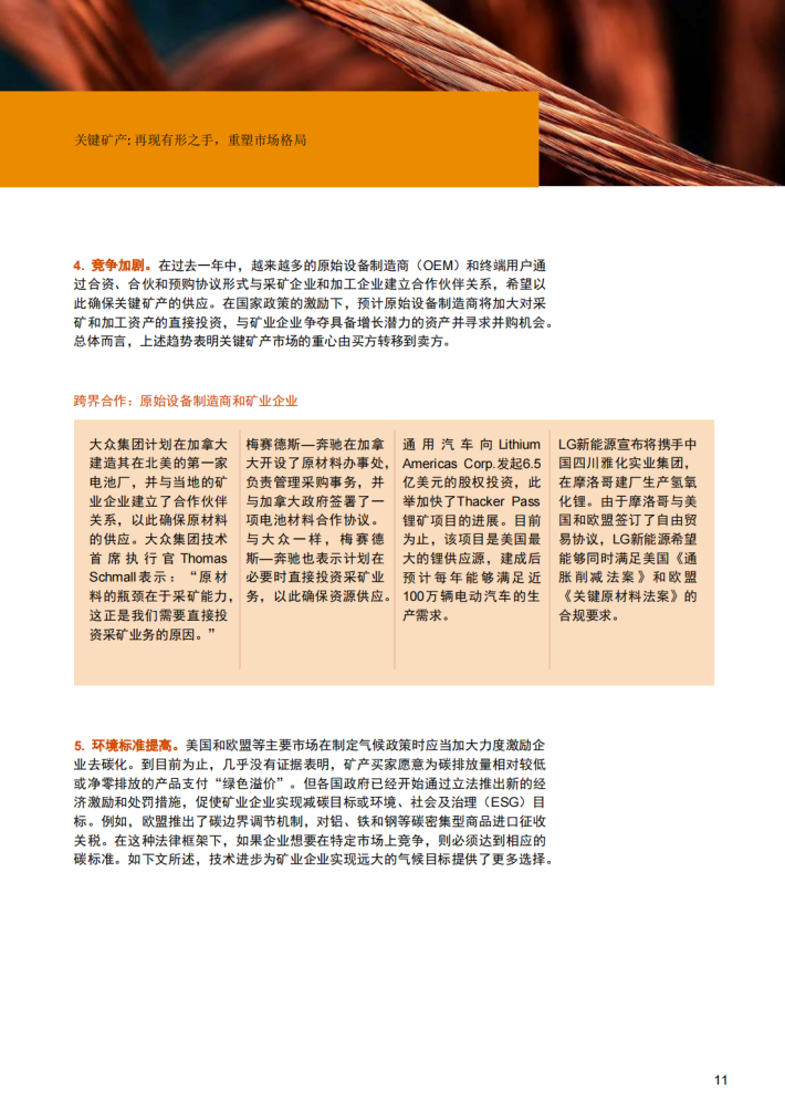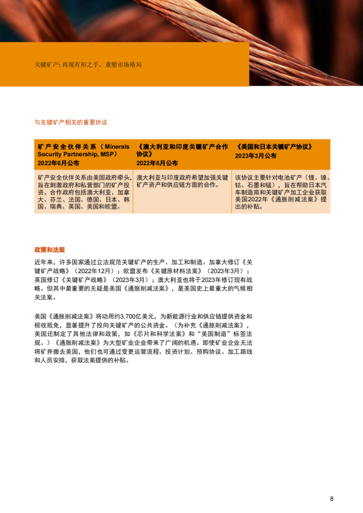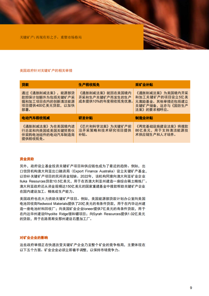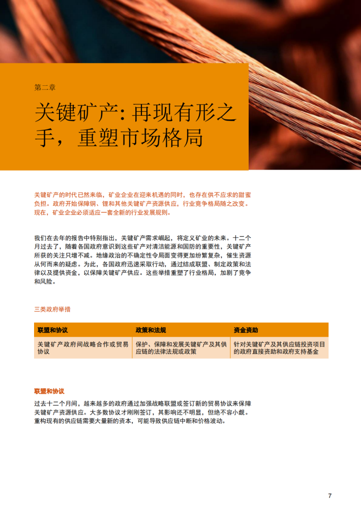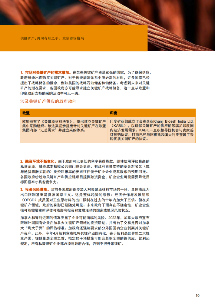 关键矿产市场上出现了一个重要的新角色:政府。这一重大转变需要矿业企业的积极回应。在看到需求的快速增长及供应链集中的潜在风险后,政府已经形成了联盟,制定了新的政策,并调动资金以确保获得关键矿产。这些举措将改变采矿业。例如,公共资金的流入意味着矿业企业必须重新考量他们在采矿或供应链资产的预期回报率。由于政府通过激励和干预措施改变了竞争环境,矿业企业还将要面对更高的投资风险和更多的竞争。